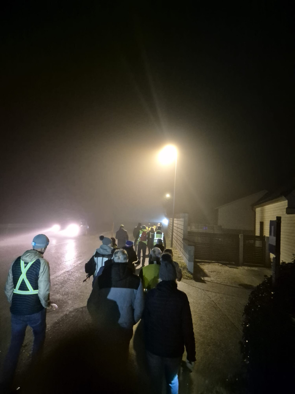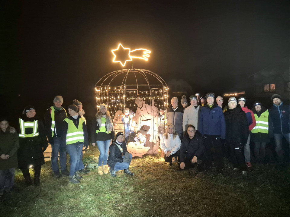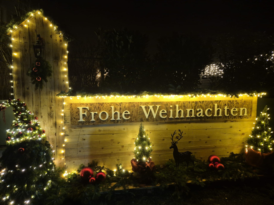 Die Gruppe, ausgestattet mit Reflektoren für die Sicherheit, startete mit einem kurzen Workout und marschierte dann zur magisch beleuchteten Christkindlstraße. Dort angekommen, genossen wir die festliche Dekoration, besonders die große beleuchtete Krippe und das Schild "Frohe Weihnachten".